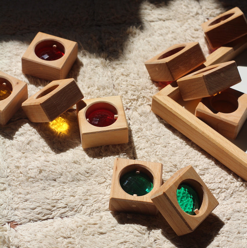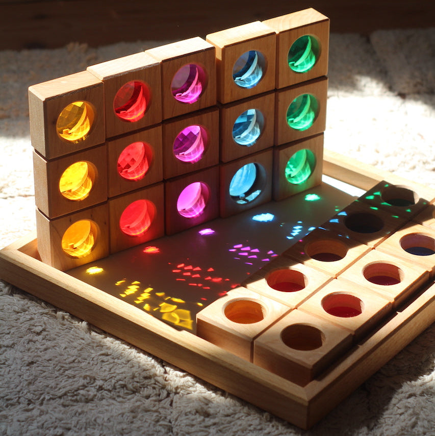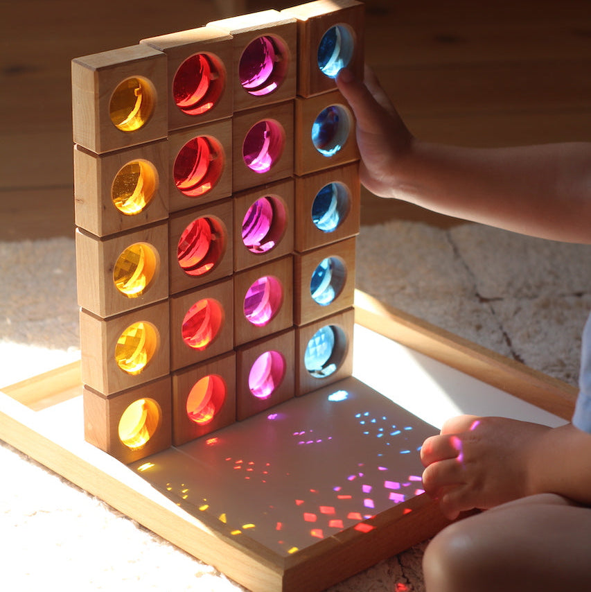 Mit 25 Bausteinen im Holzrahmen bietet das Set vielseitige Möglichkeiten für freies, kreatives Bauen. Türme, Mauern oder Fenster entstehen immer wieder neu und laden dazu ein, mit Form, Licht und Raum zu experimentieren. Dabei werden Wahrnehmung, Feinmotorik und räumliches Denken spielerisch gefördert. Das klare, reduzierte Design lenkt den Blick bewusst auf die optischen Effekte und unterstützt ein konzentriertes, fantasievolles Spiel.