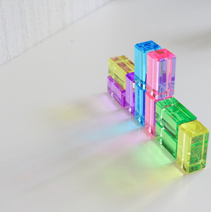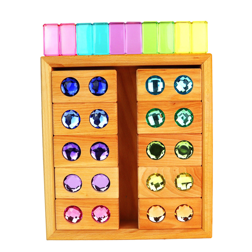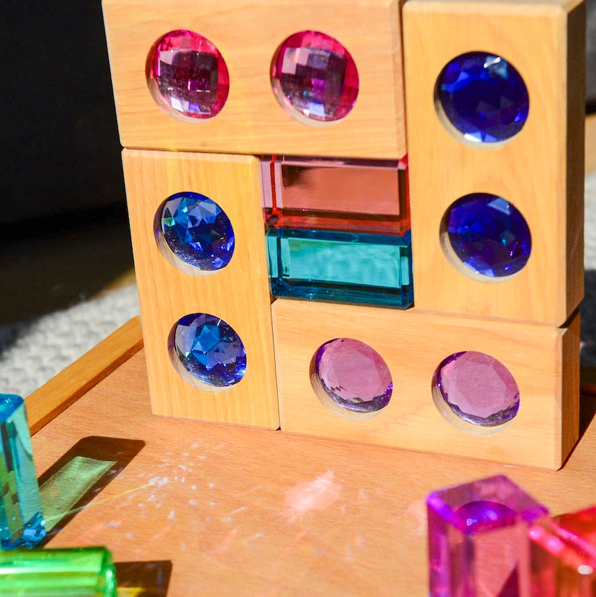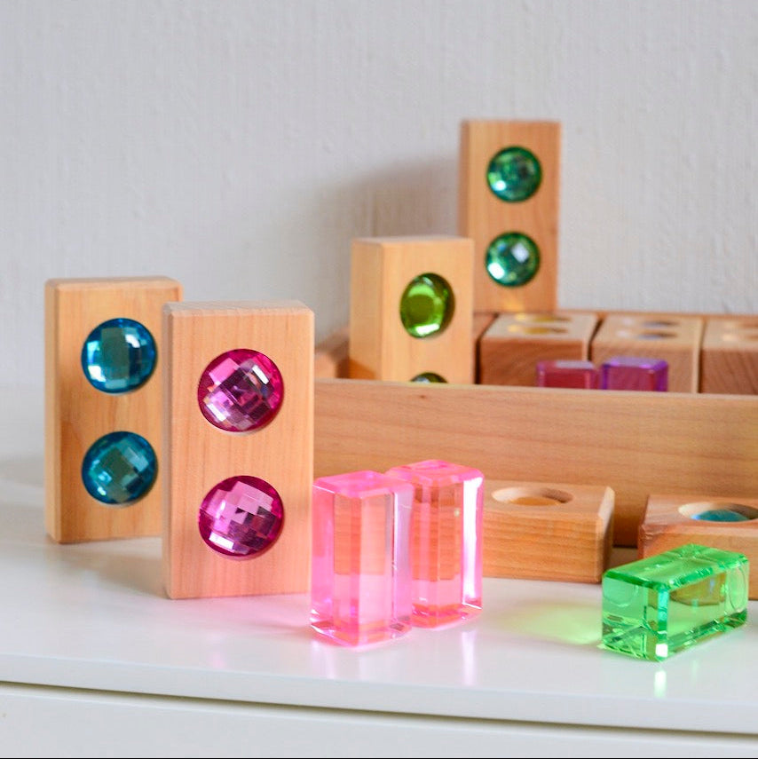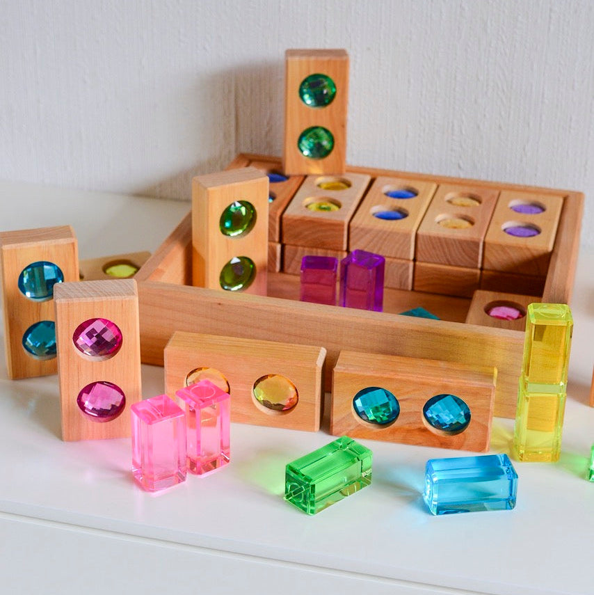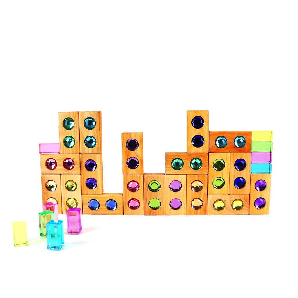 Mit den 30 Elementen lassen sich fantasievolle Brücken, Gebäude und kleine Stadtlandschaften gestalten. Die Kombination aus massivem Holz und transparenten Farbelementen regt zum Experimentieren mit Licht, Formen und Proportionen an und fördert dabei spielerisch Feinmotorik sowie räumliches Denken.