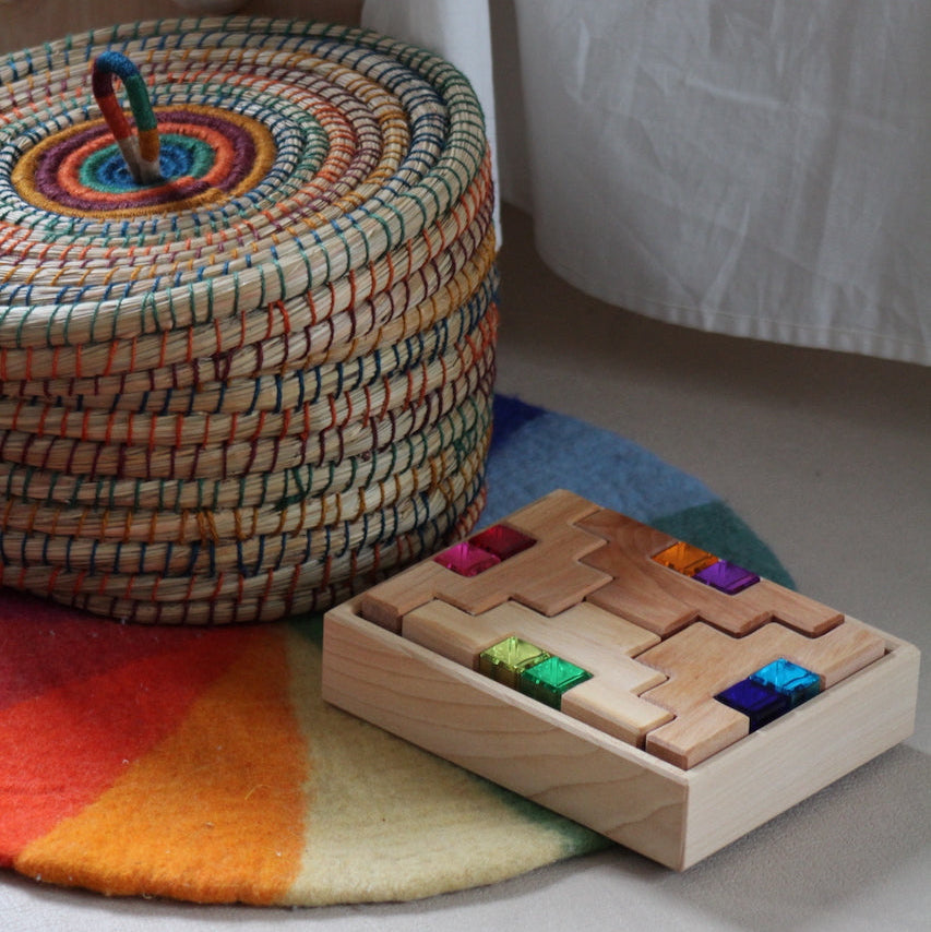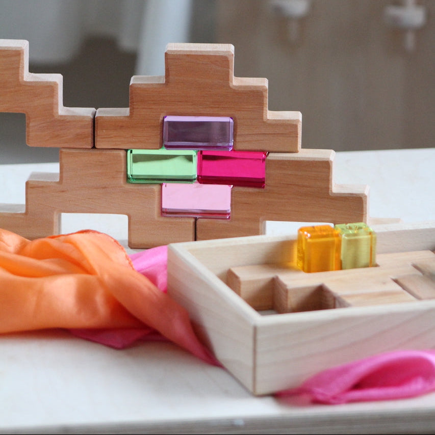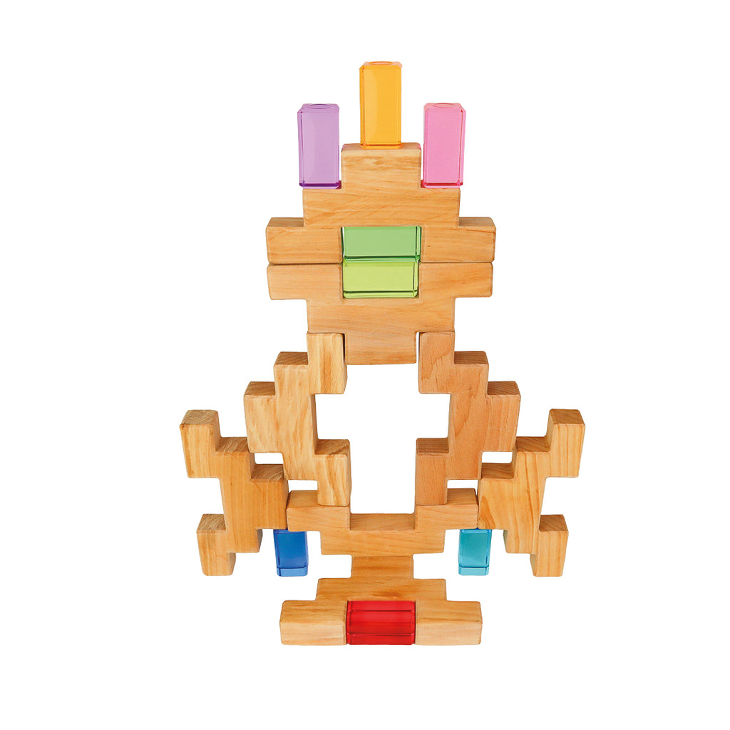 Die Treppenklötze natur mit Lichtbauquader des familiengeführten deutschen Holzspielzeugunternehmens BAUSPIEL verbinden warmes, naturbelassenes Holz mit leuchtenden Farbelementen zu einer stimmigen Bauwelt voller Licht und Struktur. Acht Treppenklötze aus Holz treffen auf acht bunt schimmernde Lichtbauquader, die sich zu fantasievollen Türmen, Brücken oder leuchtenden Fenstern kombinieren lassen. Die klare Formensprache und das reduzierte Design laden zu kreativen Bauideen ein und setzen dabei zarte Farbakzente. So entstehen stabile Konstruktionen mit spannenden Höhenverläufen und Durchblicken. Im Zusammenspiel mit natürlichem Licht entfalten die Acrylelemente ihre besondere Wirkung und bringen Bauwerke zum Leuchten. Beim freien Konstruieren werden Feinmotorik, Konzentration sowie Farb- und Formwahrnehmung spielerisch gefördert.