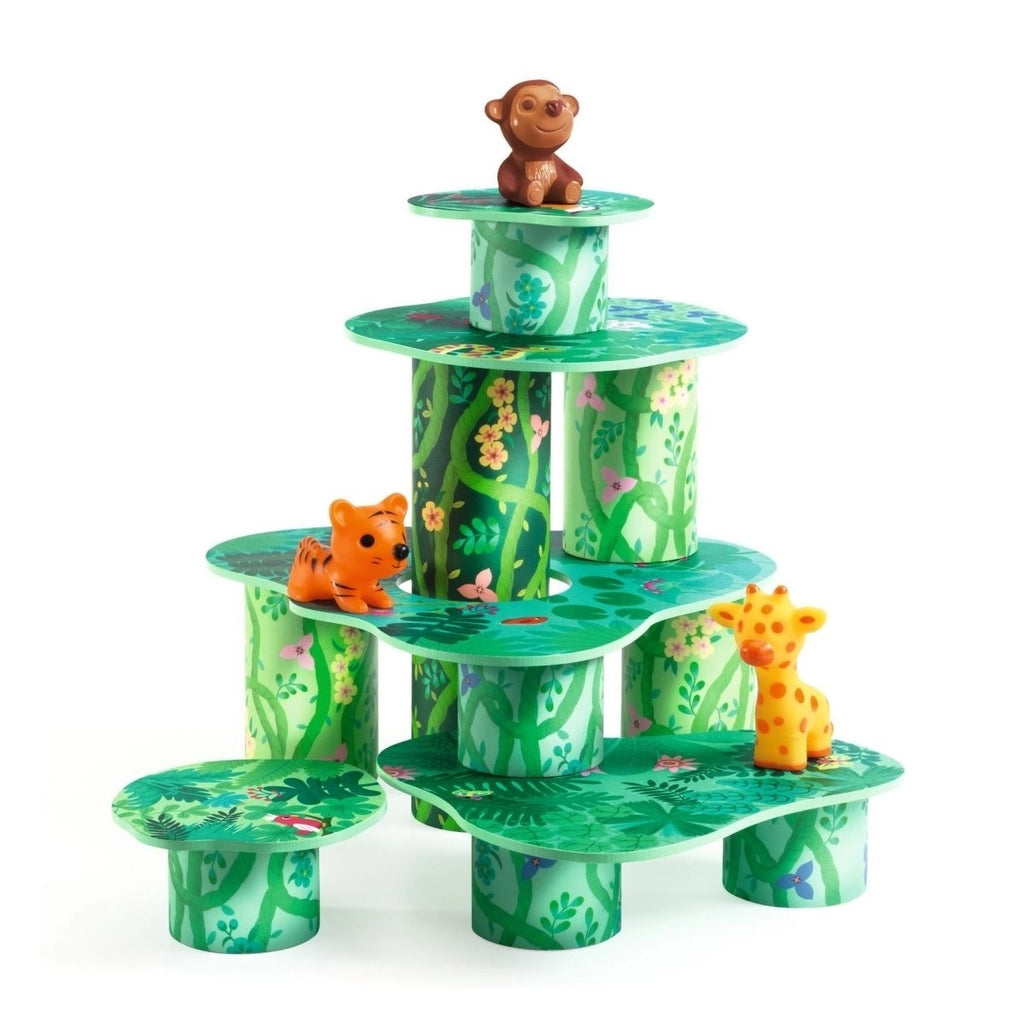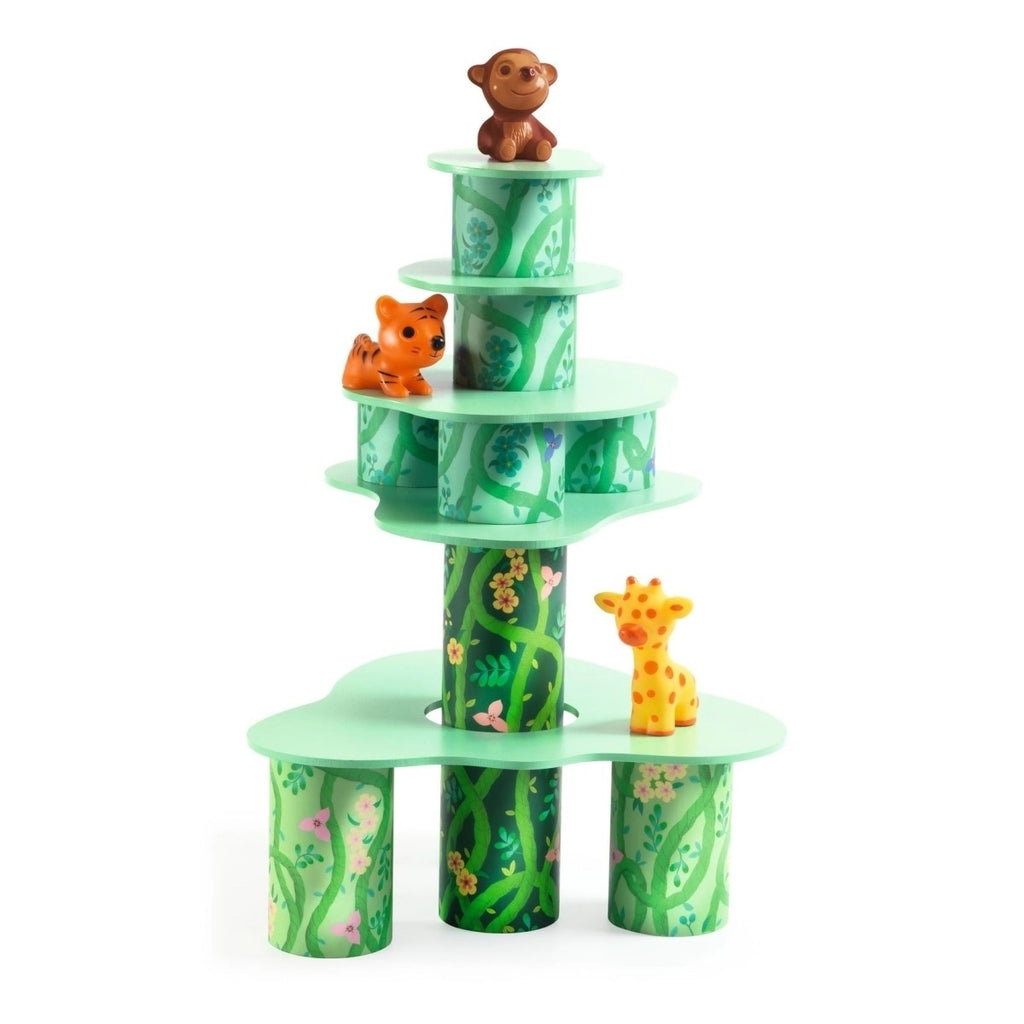 Das Stapelwürfel-Spielzeug TopaniTube des französischen Labels DJECO besteht aus 9 illustrierten Rohren, 5 farbigen Platten und 3 Tieren (Affe, Giraffe und Tiger).