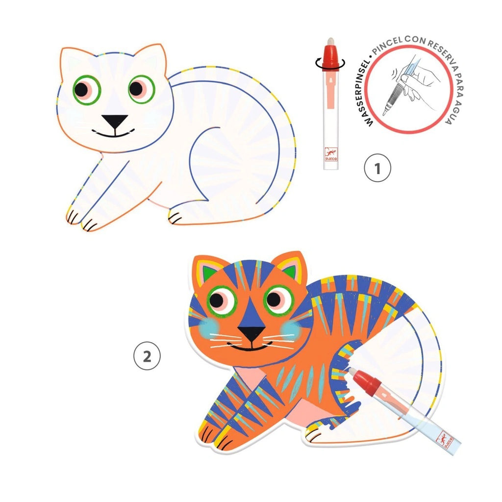 • Inhalt: 4 illustrierte Silhouetten-Vorlagen aus weichem Kunststoff mit einer weißen Fläche, die wie von Zauberhand verschwindet, ein Stift mit Wassertank und 1 Unterlage aus dickem Karton.