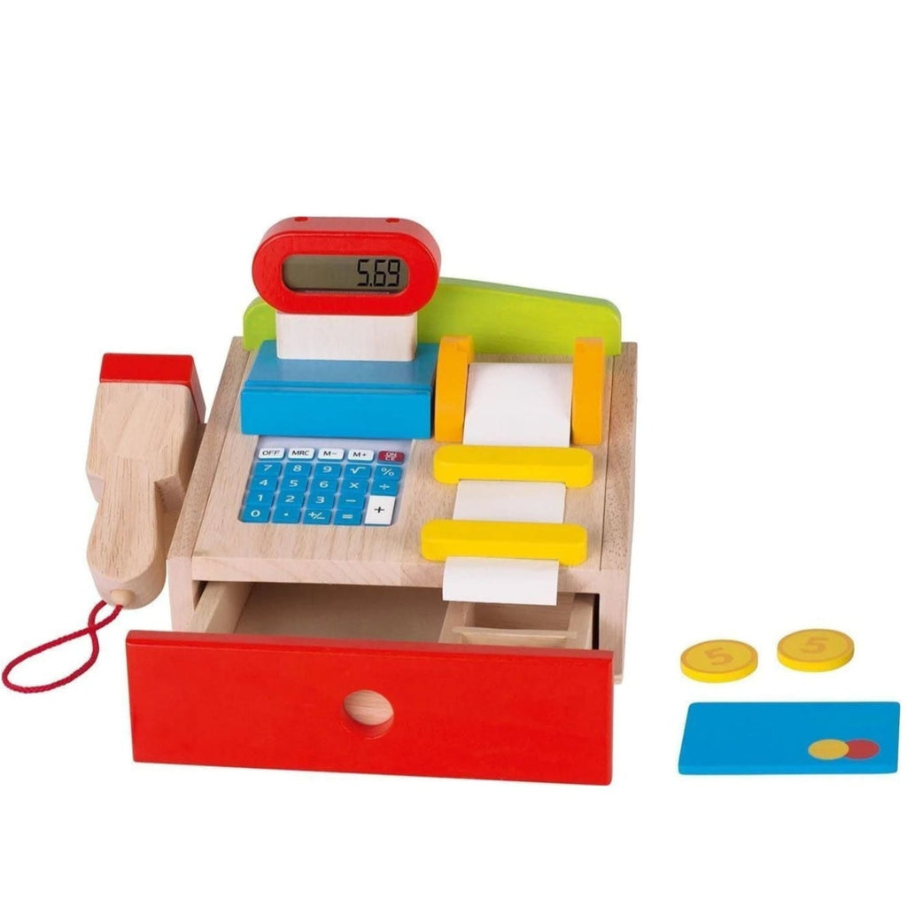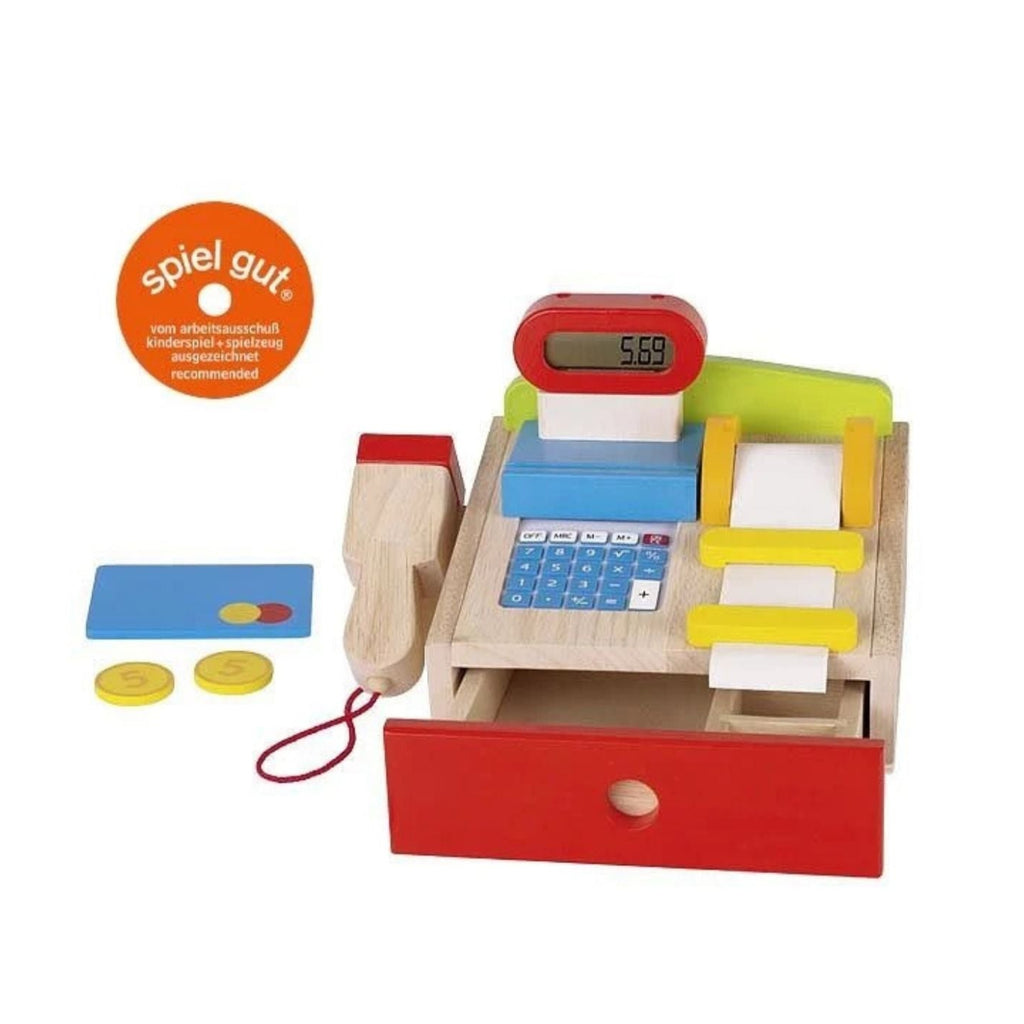 Die bunte Kaufmannsladenkasse von GOKI ist ein hochwertiges Spielzeug für Kinder ab 3 Jahren, womit fantasievolles Rollenspiel gefördert wird.