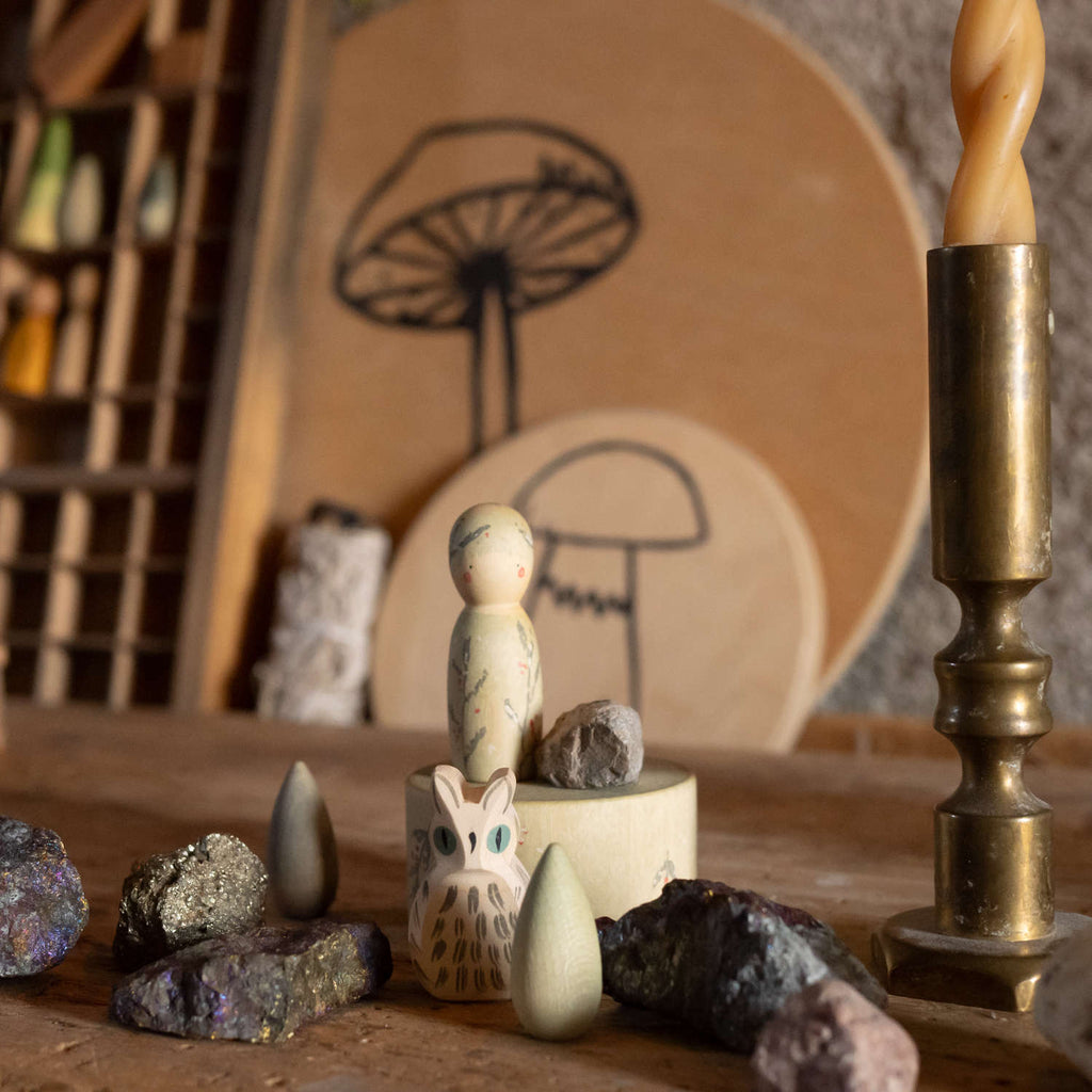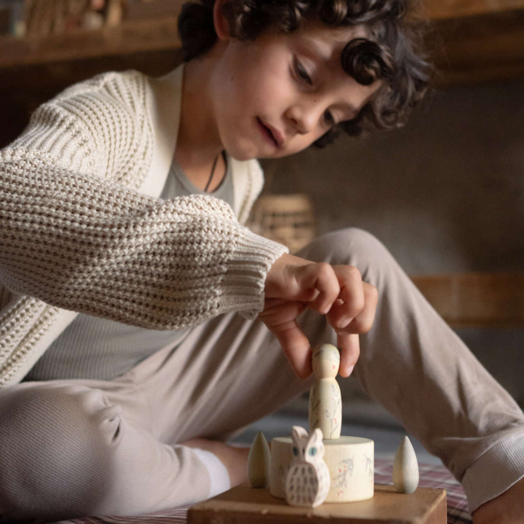 In der dekorativen Box befinden sich  fünf liebevoll ausgewählten Winter-Schätze: eine zart bemalte Holzfigur mit feinen Zweig- und Beerenmustern, eine aufmerksame Eule von Ostheimer, zwei kleine Winterbäumchen in kühlen Eis- und satten Tannentönen sowie eine schlichte Holzschale, in der all diese Elemente gesammelt werden können oder die als kleine Bühne für winterliche Spielszenen dient. Die Figuren sind so gestaltet, dass sie vielfältige Spielmöglichkeiten bieten und die Kreativität anregen. Gemeinsam erzählen sie von stillen Spaziergängen im Mondschein, funkelnden Sternenhimmeln und der besonderen Friedlichkeit dieser Jahreszeit.