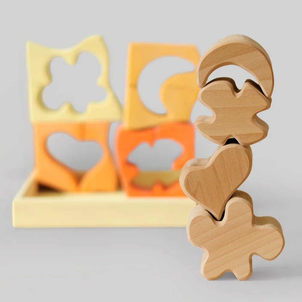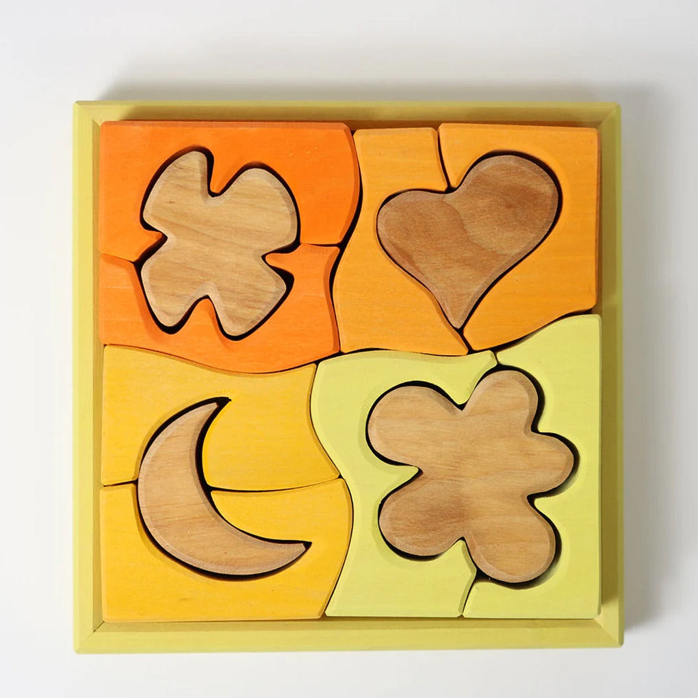 Die organisch geschwungenen Bausteine zeigen natürliche Motive wie Herz, Mond oder Kleeblatt und fügen sich zu einem Bild voller Leichtigkeit. Werden die Steine aus dem Rahmen genommen, beginnt das freie Bauen und Gestalten: Kinder erschaffen Bögen, Brücken, kleine Türme oder fantasievolle Sommerlandschaften. Dabei werden Feinmotorik, Hand-Auge-Koordination, räumliches Denken und Kreativität gefördert – ganz im Sinne der Waldorfpädagogik.