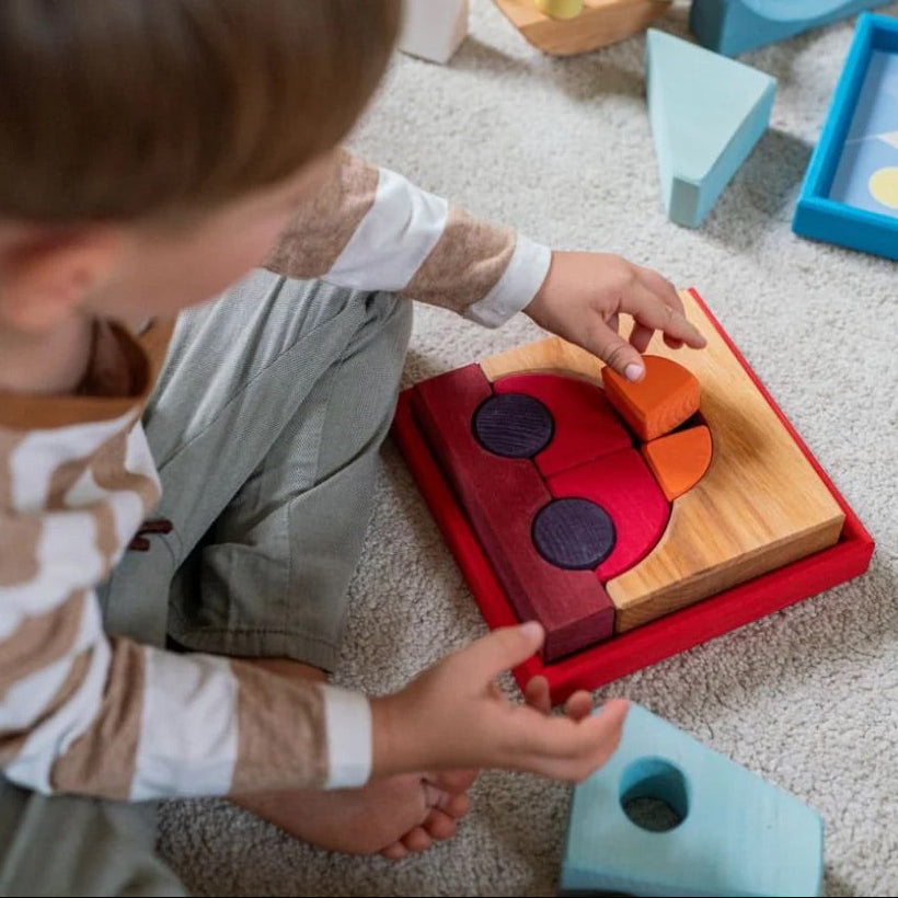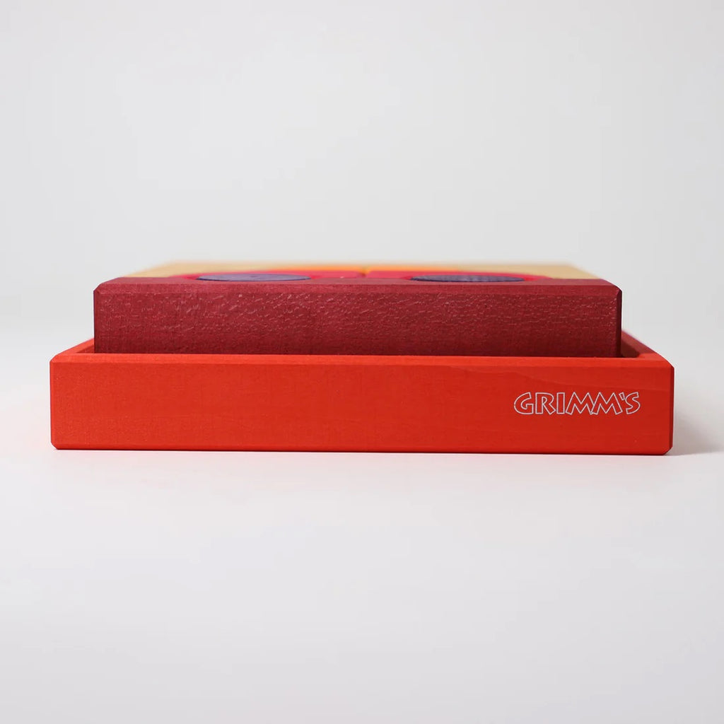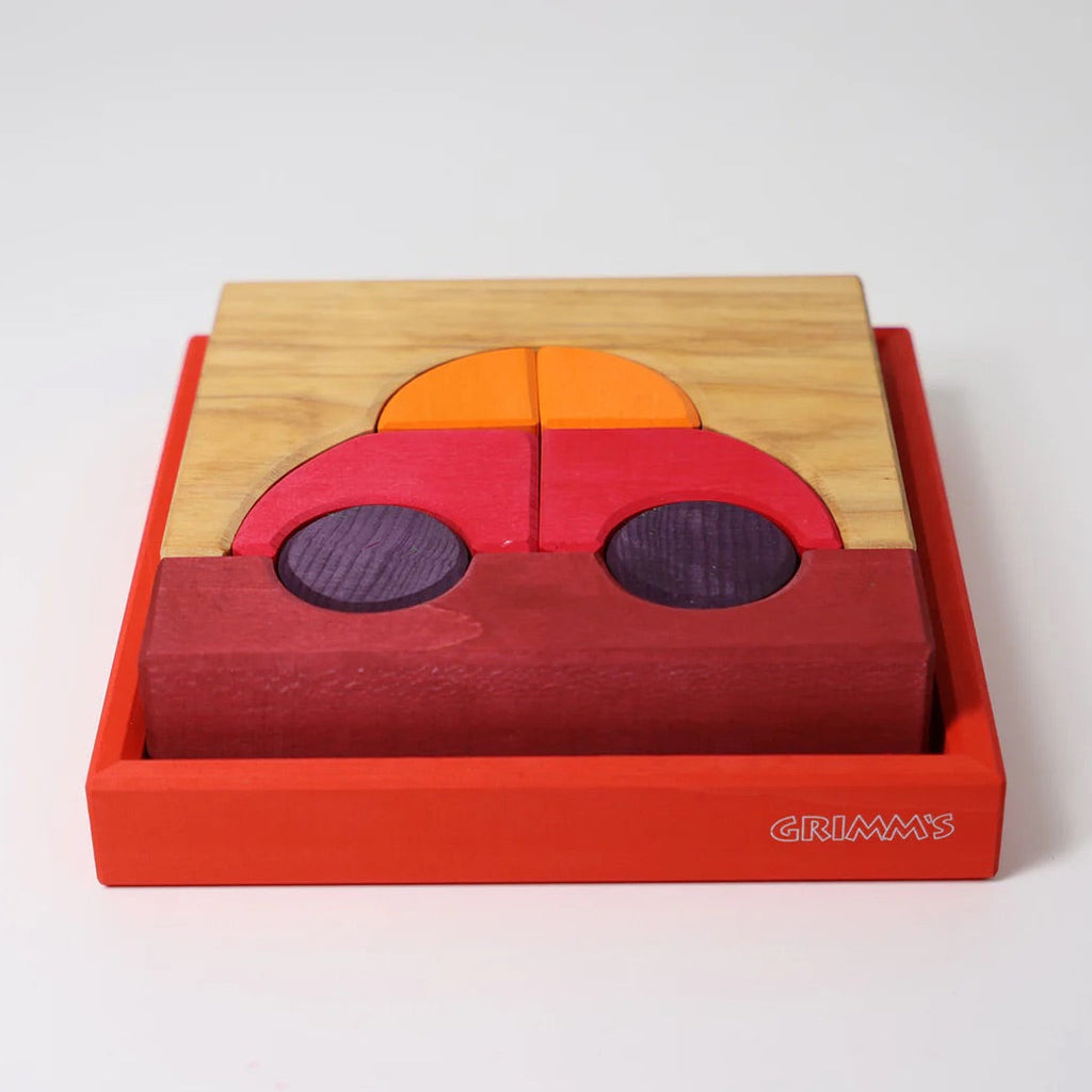 Das Bauspiel Rot von GRIMM’S lädt Kinder ab 1 Jahr zu einer leuchtenden Entdeckungsreise in die Welt der Formen und Farben ein. In kräftigen Rot- und Orangetönen gestaltet, erzählt das Set zunächst die Geschichte eines Autos im Abendlicht – und verwandelt sich, sobald die Teile aus dem Rahmen genommen werden, in ein vielseitiges Bauspiel für freies, fantasievolles Konstruieren.