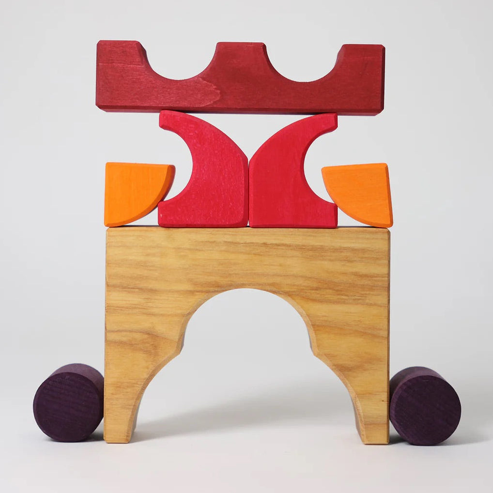 Das Bauspiel Rot von Grimm's sieht auf den ersten Blick aus wie ein reines Puzzle - doch die toll geformten Holzteile lassen sich im freien Spiel ungemein vielfältig einsetzen!