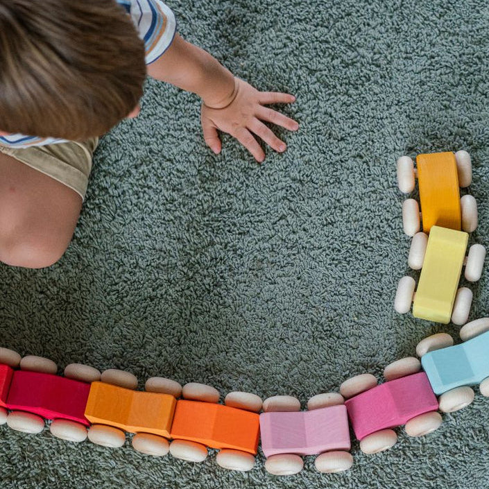 Jedes Auto-Set besteht aus harmonisch aufeinander abgestimmten Farbduos und lässt sich mit anderen Grimm’s Holzspielzeugen wunderbar kombinieren. Ob beim Transport von Figuren, Bausteinen oder kleinen Schätzen – die Stapel-Autos fördern spielerisch Feinmotorik, Hand-Auge-Koordination und räumliches Denken, während Kinder gleichzeitig ihrer Fantasie freien Lauf lassen.
