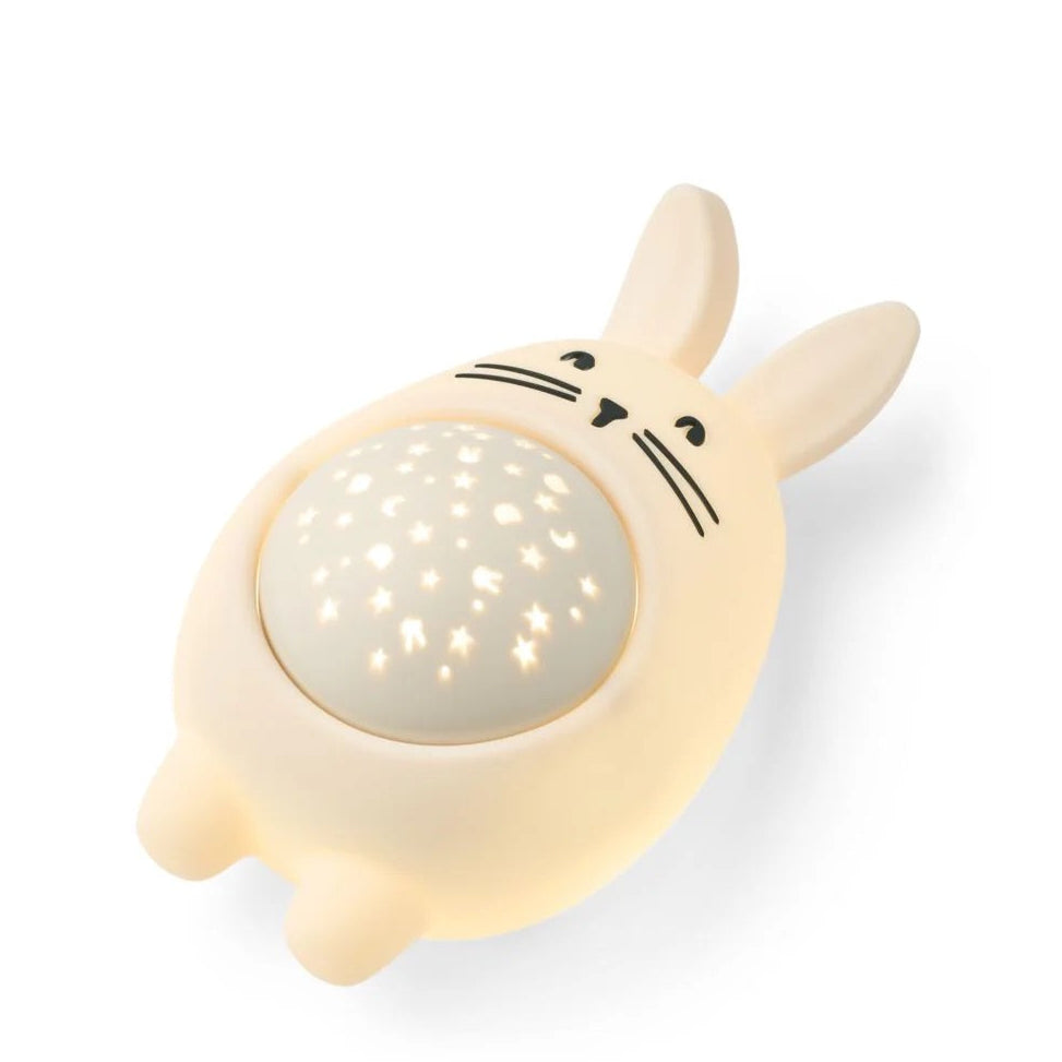 Die tragbare Sound- und Projektorlampe (Modell: Rabbit, Sandy) des dänischen Labels LIEWOOD verwandelt das Kinderzimmer in einen Nachthimmel, der mit süßen Figuren und Sternen geschmückt ist! Das Nachtlicht ist in Form eines schläfrigen Häschens geformt.