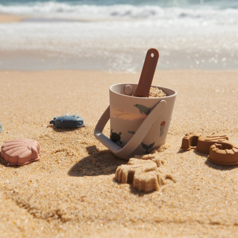 Das sommerlich-verzierte Strand-Set Gilma des dänischen Labels LIEWOOD besteht aus einem Eimer mit Henkeln, einer Schaufel und vier weichen Meerestiere-Förmchen (Seepferdchen, Fisch, Muschel und Krebs) aus Silikon. Die Silikonformen lassen sich bereits von kleinen Händen gut greifen und fördern so neben der Kreativität auch die Motorik des Kindes.
