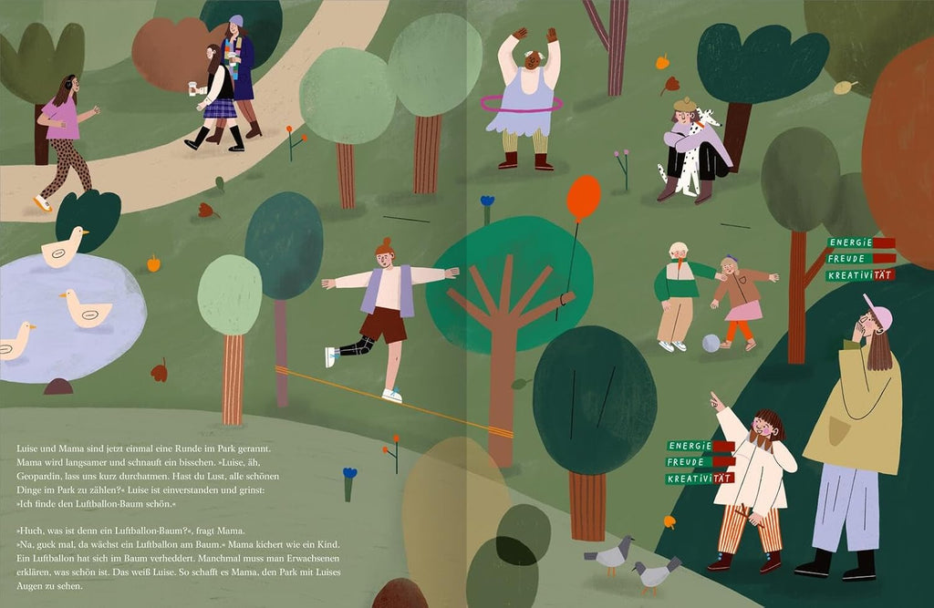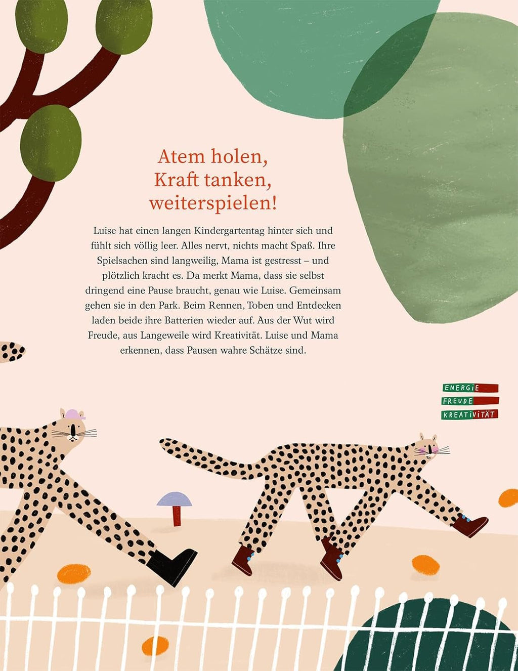 Luise hat einen langen Kindergartentag hinter sich und fühlt sich völlig leer. Alles nervt, nichts macht Spaß. Ihre Spielsachen sind langweilig, Mama ist gestresst – und plötzlich kracht es. Da merkt Mama, dass sie selbst dringend eine Pause braucht, genau wie Luise. Gemeinsam gehen sie in den Park, wo frische Luft, bunte Blätter und die Vorstellung, so schnell wie ein Geopard zu rennen, Luises Laune aufhellen. Beim Rennen, Toben und Entdecken laden beide ihre Batterien wieder auf. Aus der Wut wird Freude, aus Langeweile wird Kreativität. Am Ende basteln Luise und ihre Mama eine Schatzkarte mit all den schönen Dingen, die sie entdeckt haben – und erkennen, dass Pausen wahre Schätze sind.