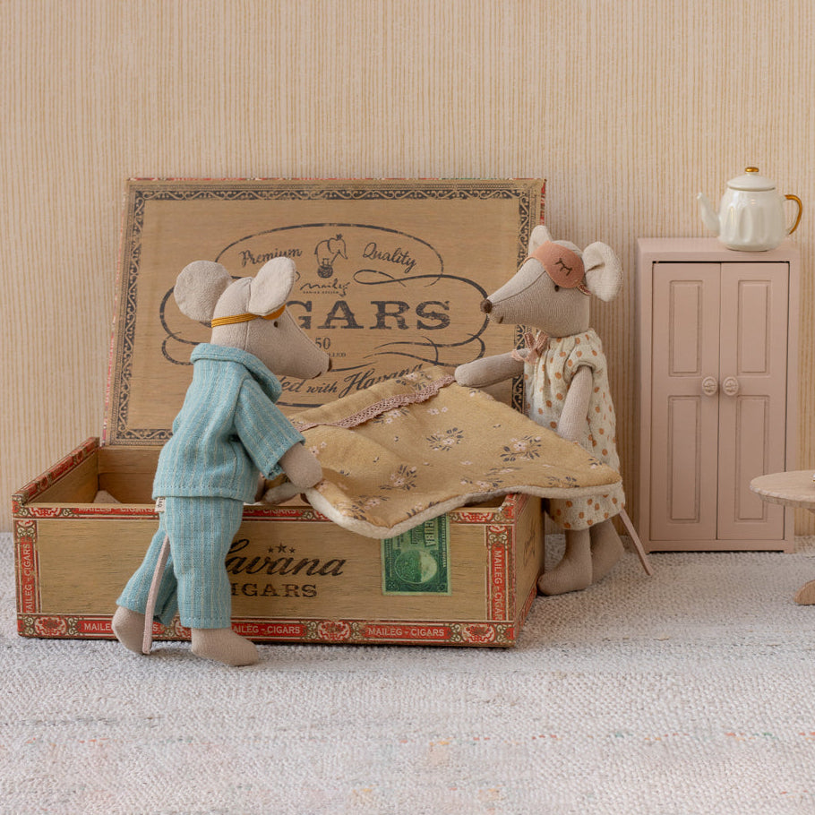 Dieses niedliche Mäuse-Elternpaar des dänischen Labels MAILEG hat es sich in der schönen Zigarrenkiste gemütlich gemacht! In der Kiste befindet sich ein weicher Schlafsack, in dem die beiden Mäuse bequem nebeneinander schlafen können. Mama und Papa Maus haben bereits ihre schönste Nachtwäsche und (abnehmbare) Augenmasken an.