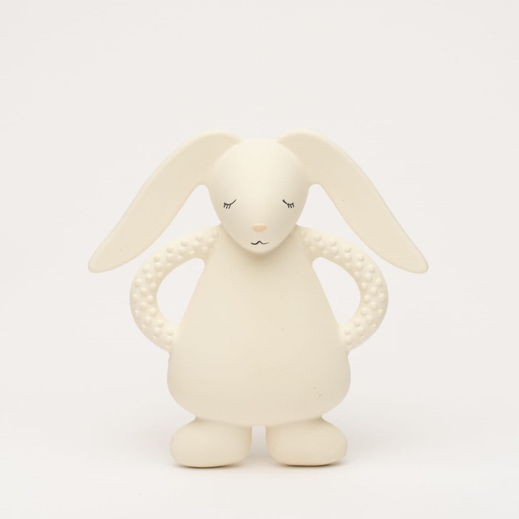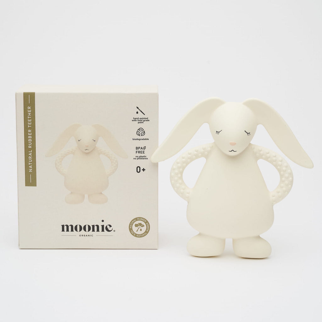 Der natürliche Kautschuk-Beißring von MOONIE in Hasen-Form im edlen Creme-Farbton unterstützt Babys beim Zahnen und bietet gleichzeitig sichere sensorische Erfahrungen.