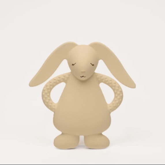 Der natürliche Kautschuk-Beißring von MOONIE in Hasen-Form im edlen Sand-Farbton unterstützt Babys beim Zahnen und bietet gleichzeitig sichere sensorische Erfahrungen.