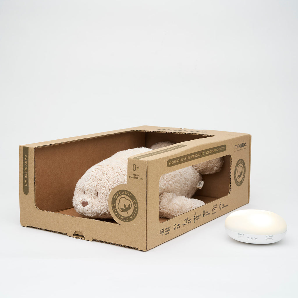 Diese bezaubernde Robbe der polnischen Marke MOONIE im edlen Sand-Farbton ist vielseitige Einschlafhilfe und Kuscheltier in einem - davon profitieren Baby UND Eltern! Es handelt sich dabei um das neueste Modell von Moonie (moonie 2.0).