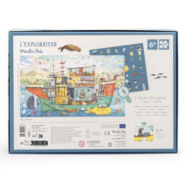 Das liebevoll illustrierte Puzzle „Boot“ aus der „Les Petits“-Kollektion von MOULIN ROTY entführt Kinder und Erwachsene in eine fröhliche Welt auf dem Wasser. Die 200 Teile fügen sich zu einem detailreichen Bild zusammen, das ein farbenfrohes Boot inmitten einer lebhaften Szene zeigt. Nach dem Zusammensetzen des Puzzles können Kinder mithilfe der im Lieferumfang enthaltenen kleinen Lupe sowie eines Aufgaben-Posters Suchaufgaben lösen.