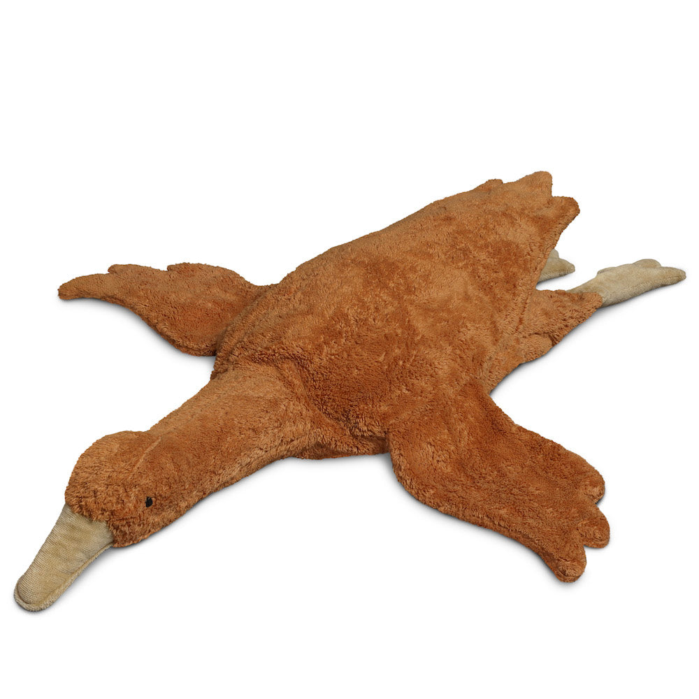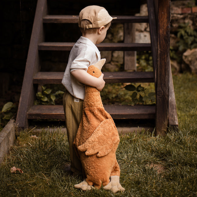Vom Schnabel bis zur Fußspitze misst die Rostfarbene Gans stolze 80 cm, wohingegen die Länge vom Schnabel bis zum Schwanz bei 60 cm liegt. In liebevoller Handarbeit gefertigt und mit aufwendig gesticktem Gesicht ist jede Gans ein echtes Unikat und aufgrund der hochwertigen absolut schadstofffreien Materialien sowie Verarbeitung ein echter „Freund fürs Leben“. Außen besteht die Gans aus hochwertigem Baumwollplüsch aus 100% handgewebter Bio-Baumwolle. Der Hals ist gefüllt mit Schurwolle von Eifelschafen, wohingegen das herausnehmbare Baumwoll-Wärmekissen mit Dinkelspreu aus kontrolliert biologischem Anbau von der Schwäbischen Alb gefüllt ist.