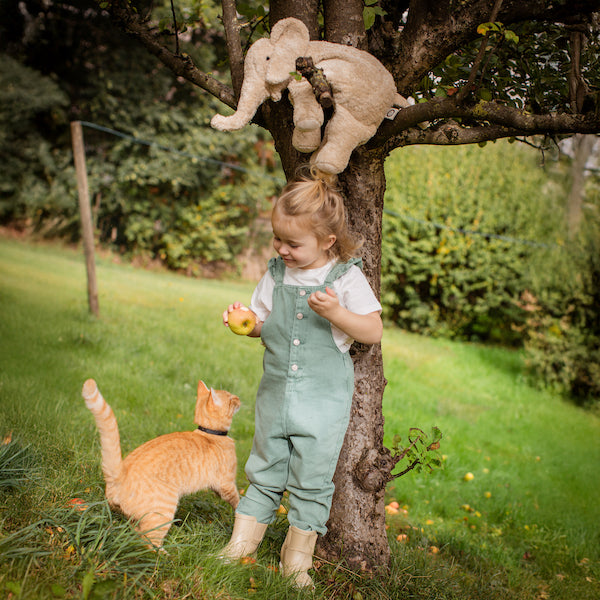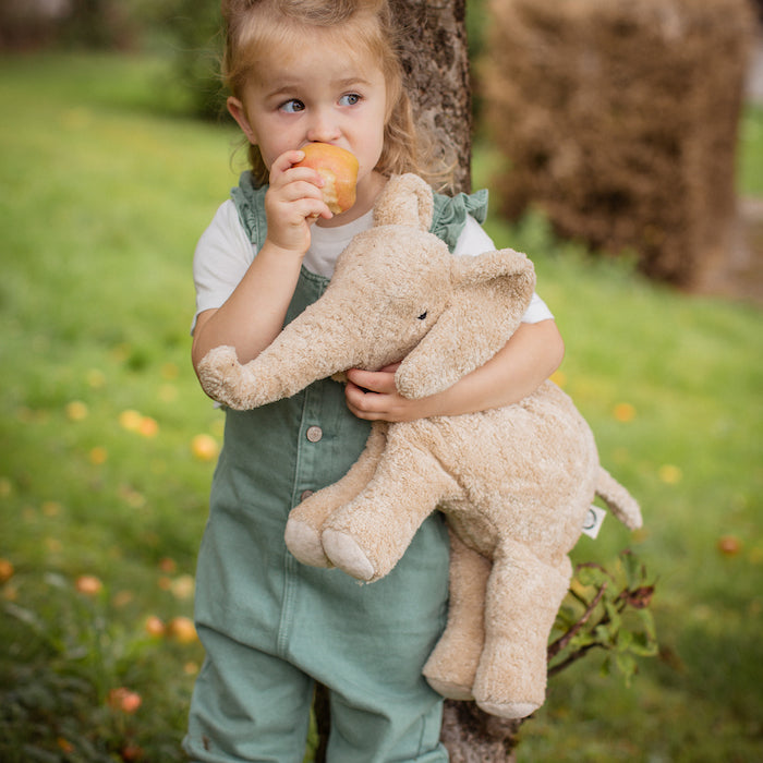 Der 46 cm lange Elefant ist in liebevoller Handarbeit gefertigt und mit seinem aufwendig gesticktem Gesicht ist jedes Exemplar ein echtes Unikat. Aufgrund der hochwertigen absolut schadstofffreien Materialien sowie Verarbeitung ist der große Elefant ein echter „Freund fürs Leben“, der schon Babys ab 2 Monaten zum ausgiebigen Kuscheln einlädt. Außen besteht der Elefant aus hochwertigem handgewebtem Baumwollplüsch aus 100% Bio-Baumwolle. Der Hals und die Beine sind gefüllt mit Schurwolle von Eifelschafen, wohingegen das herausnehmbare Baumwoll-Wärmekissen mit Dinkelspreu aus kontrolliert biologischem Anbau von der Schwäbischen Alb gefüllt ist.