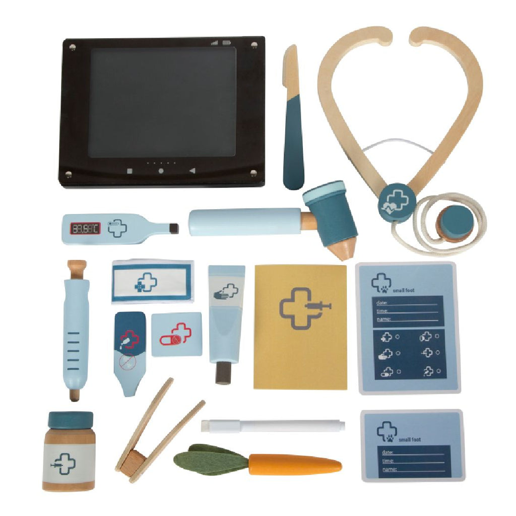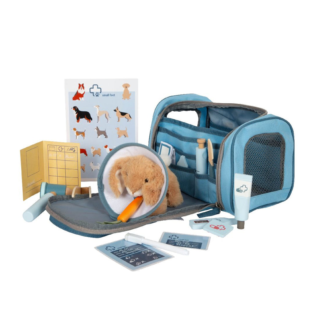 • Inhalt: 1x Tragetasche, 1x Hase, 1x Röntgengerät, 4x Röntgenbilder, 1x Verband, 1x Schutzkragen, 1x Otoskop, 1x Fieberthermometer, 1x Spritze, 1x Medikamenten Dose, 1x Pillenblister, 1x Anti-Floh-Mittel, 1x Salbentube, 1x Skalpell, 1x Pinzette, 1x Stethoskop, 1x Karotte, 1x Stift, 1x Impfpass, 2x Patientenkarten